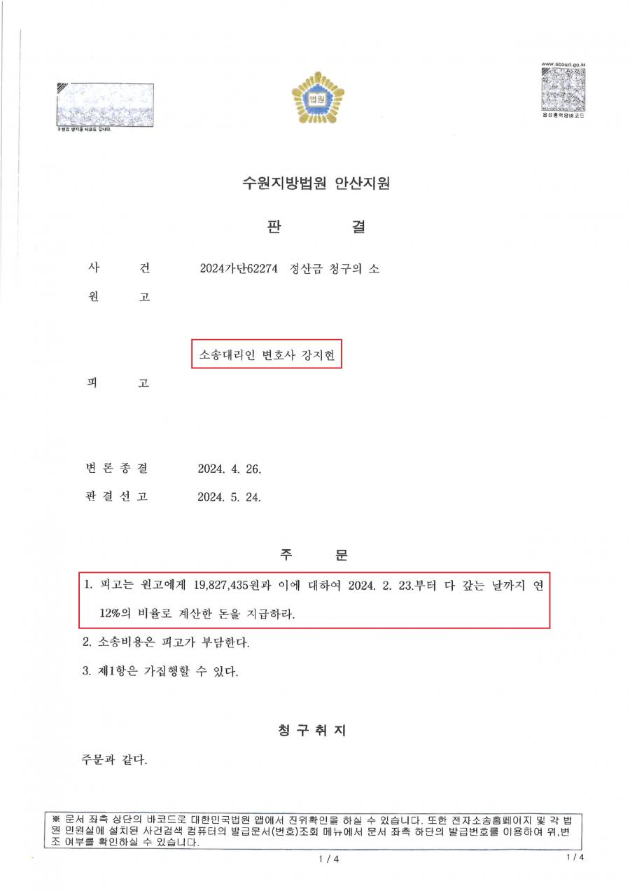 - 사건 : 수원지방법원 안산지원 2023가소119030호 - 판결요지 : 작성된 차용증을 근거로 약정금 청구를 구한 사건으로, 상대방은 위 차용증이 협박에 의해 작성된 것이라고 주장하였으나, 차용증 작성 경위 등을 소명하여 상대방의 주장을 반박한 사건